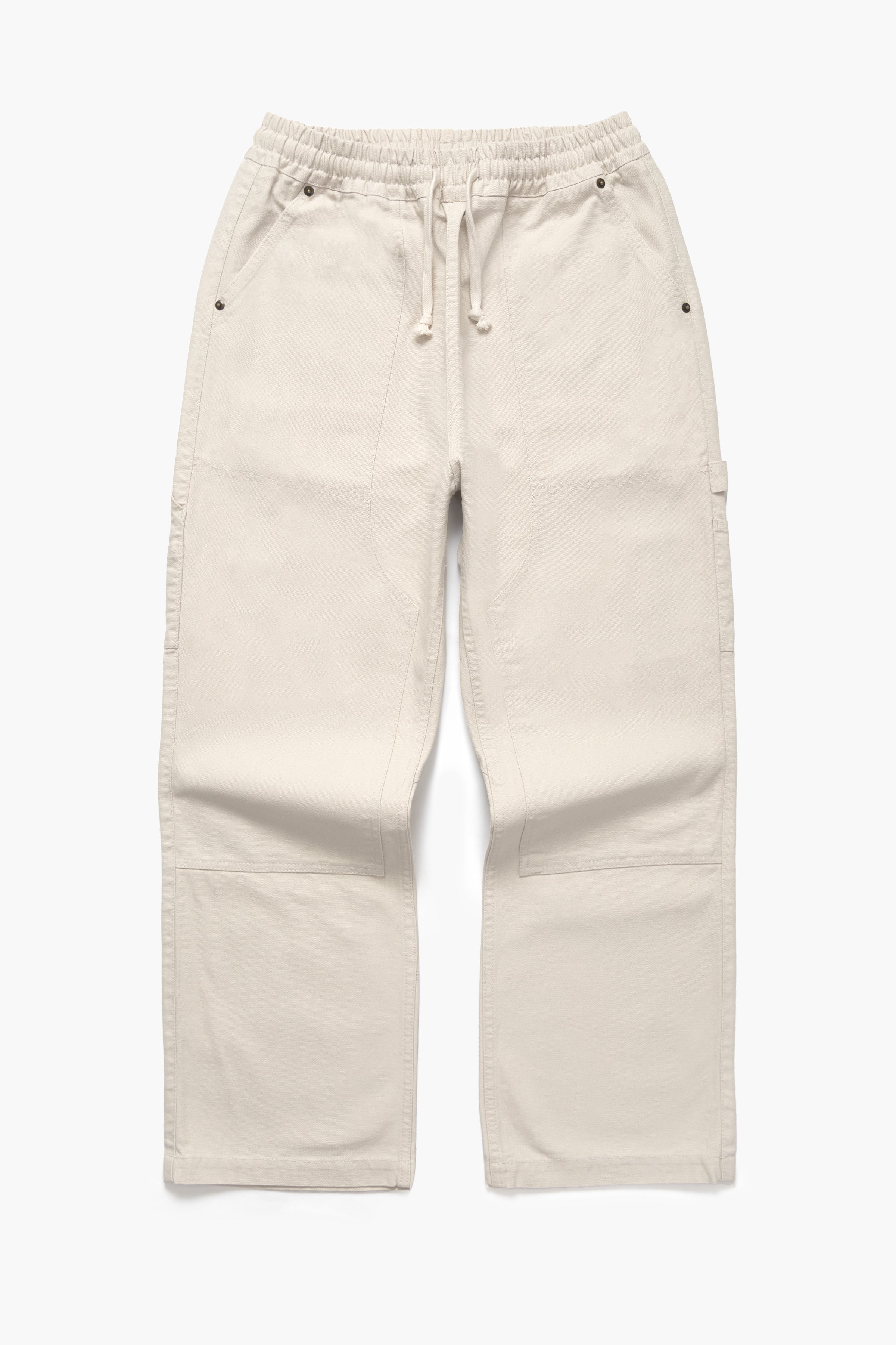 Relaxed/straight fit pants with 2-front raised fatigue pockets, 2-back patch pockets, double knee, hammer loop with utility pockets, stacked pockets, elasticated waistband, reinforced crotch panel, external drawstring, trademark logo woven label