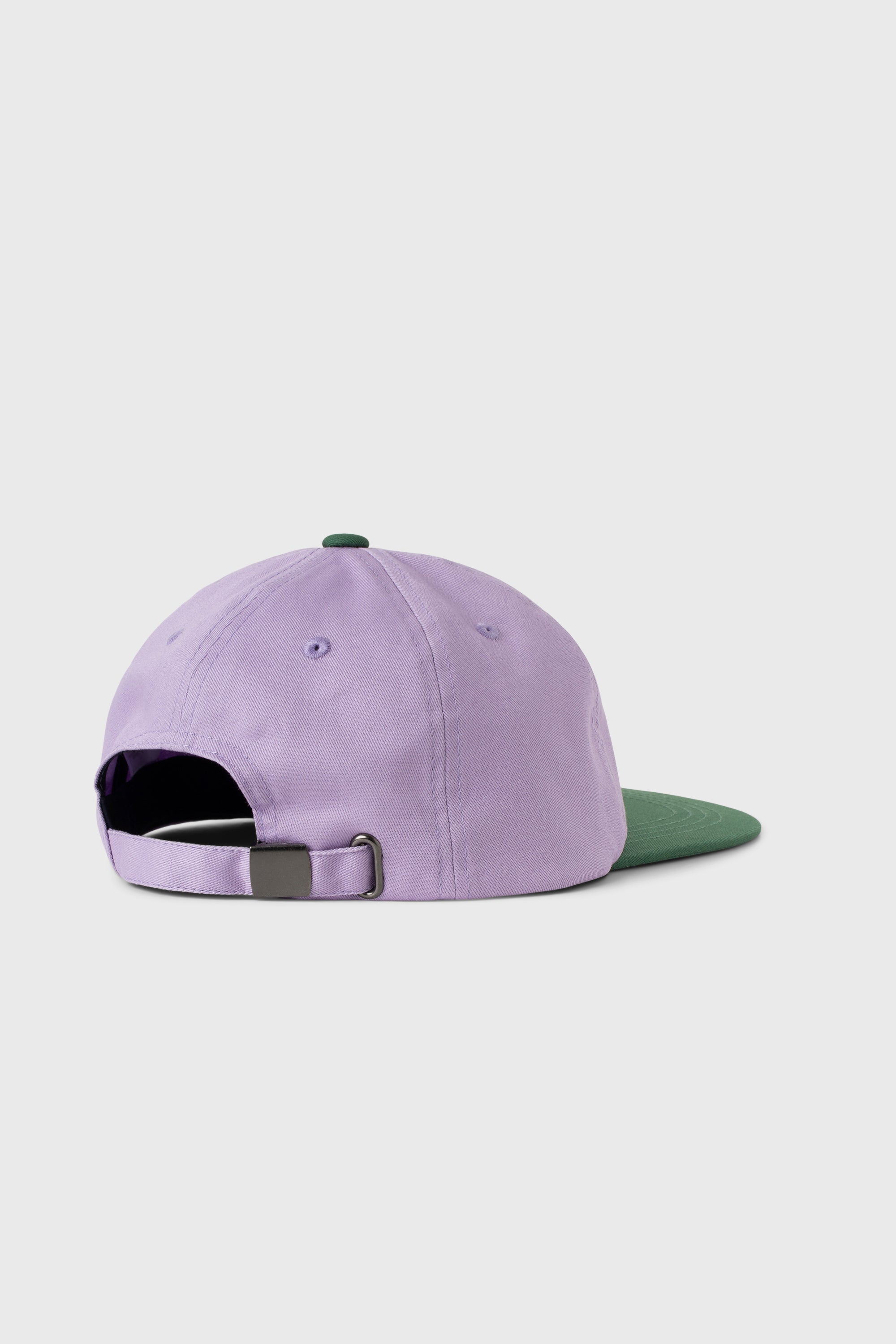 Classic ball cap shape in twill with a premium leather strap and metal fastener. One size fits all. Seen here in Lavender/Racing Green.
